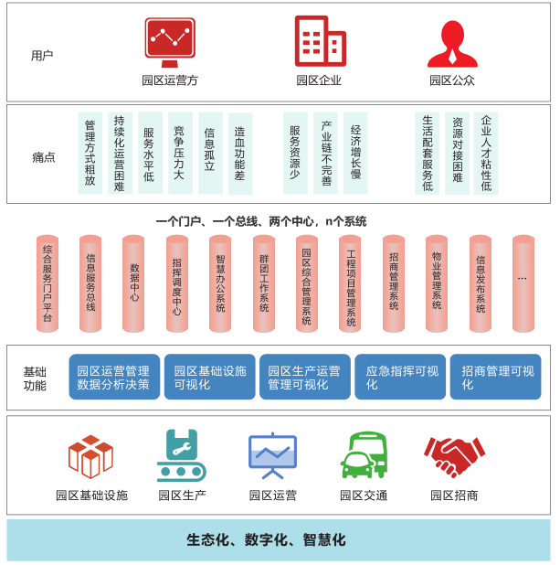 在经济快速发展和政府政策的推动下,以产业聚焦为手段的园区经济发展迅速。企业对园区信息化要求越来越高,同时对园区服务和管理水平也提出了更高的要求。为推动产业园区的信息化建设,构建互联互通、资源共享的信息资源网络,以信息化带动产业化,将园区打造成为高新技术产业的集中研发地,高新企业群集的区域,高新产品孵化和生产的基地,特制定以下建设方案。 一、 园区信息化现状 1、园区管理支撑、服务创新以及品牌营销等方面的整合应用存在不足。 2、园区企业规模化IT应用、特色化专业示范需要进一步提升。 3、园区管委会部门之间,以及各企业信息系统建设水平和应用层次不齐、相对孤立。这导致政府部门、企业与园区、企业与企业之间沟通障碍与资源独立。 二、 总体思路和建设目标 1、总体思路: 我们认为经济开发区必须做好三件事情: (1)生存需要:专注价值,提高绩效。 (2)长远发展:战略规划,风险管理。 (3)能力保障:管理创新提升,方法、技术应用。 2、建设目标:通过实现园区信息化,方便管理,提升服务,整合资源,提高效益。 (1)决策管控:建立决策形成、决策下达、分解执行、执行反馈的全过程闭环管理体系及支撑的IT系统。打通组织间、部门间的障碍,实现大协同。 (2)战略协同:建立文化、理念、管理思想宣传、传播的平台。建立内部知识共享、经验信息交流平台,如为垂直职能部门建立沟通交流平台。 (3)支撑体系:将管理流程电子化、自动化,固化到OA系统中,并加强过程中的文档管理。建立专项职能管理系统,如项目管理、合同管理等。 (4)合规监察:为审计监察部门提供管理合规监控平台,实现监控的自动化,常态化,并实现提醒、预警等功能。 三、 建设内容 智慧园区是在园区搭建的IT基础设施之上,构建一个基于WEB/portal的虚拟园区,运用物联网、云计算、多媒体等现代信息技术,帮助园区在信息化建设方面构建统一的组织管理协调架构、业务管理平台和对外服务平台,为园区管理者以及企业提供创新管理与运营服务。智慧园区管理平台具体包括以下方面: 1、一个门户: 建设综合服务门户平台,通过统一门户管理通过管理工作协同,园区综合管理,招商引资管理、群团组织工作等信息统一集中管理;对公众客户通过统一门户获取各种需要的业务工作,内部用户通过统一门户进行相应的管理工作,各应用平台通过统一门户接入集成管理,在统一门户完成响应的业务操作。 2、一个总线: 通过建设统一的企业服务总线平台(简称ESB系统),集中管理各个系统之间的关联,各系统模块之间无需再重复开通接口及服务,接口和服务、数据通过ESB系统集中统一管理。 3、两个中心: (1)数据中心:所有企业通过应用系统产生的业务数据,应用数据、日志数据都需要汇总的大数据中心进行数据归集,大数据中心负责数据的采集、清洗、计算、分析、并根据业务需要进行不同形式的数据呈现、通过数据分析进行目标管控、管理指导、风险管控、及企业绩效考核管理等,大数据中心结合语义理解和机器深度学习进行人工智能+读数据实践应用。 (2)指挥调度中心:实现园区一张图指挥调度。 4、八大系统: 智慧办公系统、群团工作系统、智慧园区综合管理系统、工程项目管理系统、招商管理系统、物业管理系统、人资管理系统、信息发布系统。